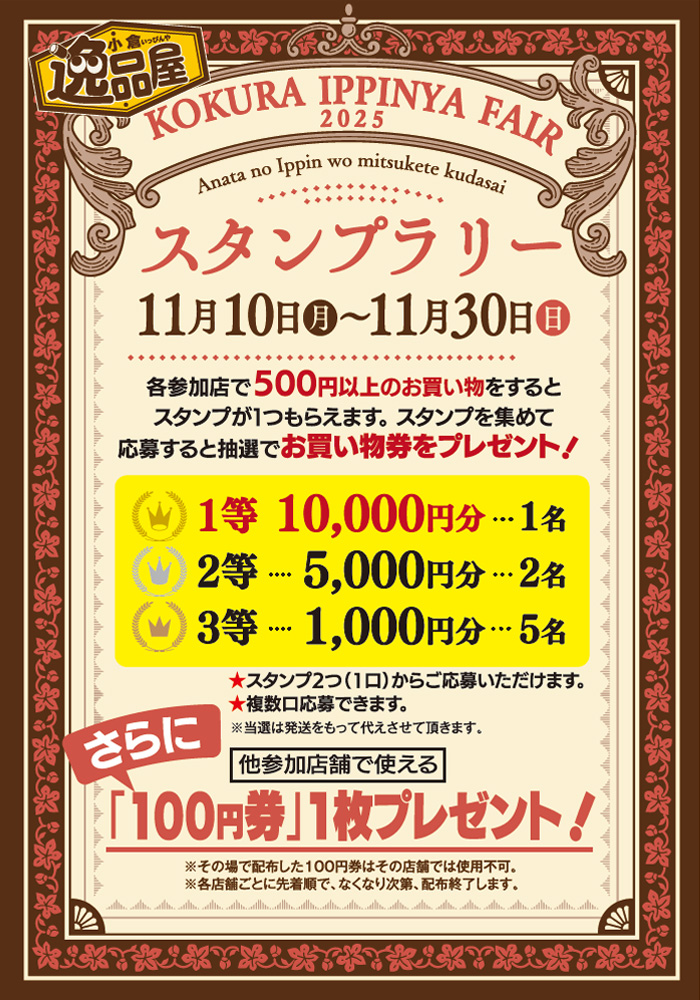 令和6年10月26日㈯~11月17日㈰に、 逸品参加店で500円以上のお買い物をするとスタンプ1つ押します。 スタンプを2つ集めると、逸品参加店で使える商品券が抽選で当たります! 11月9日㈯、10日㈰に開催されます日専 […]